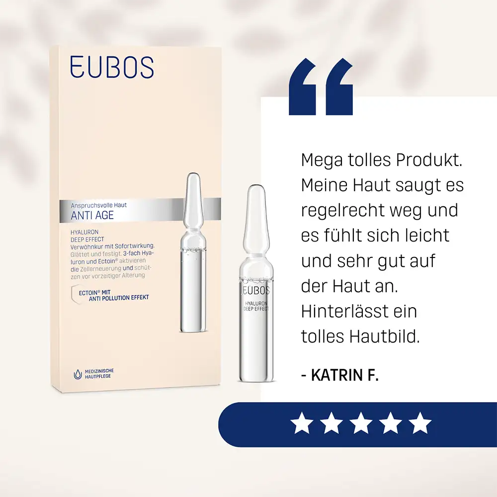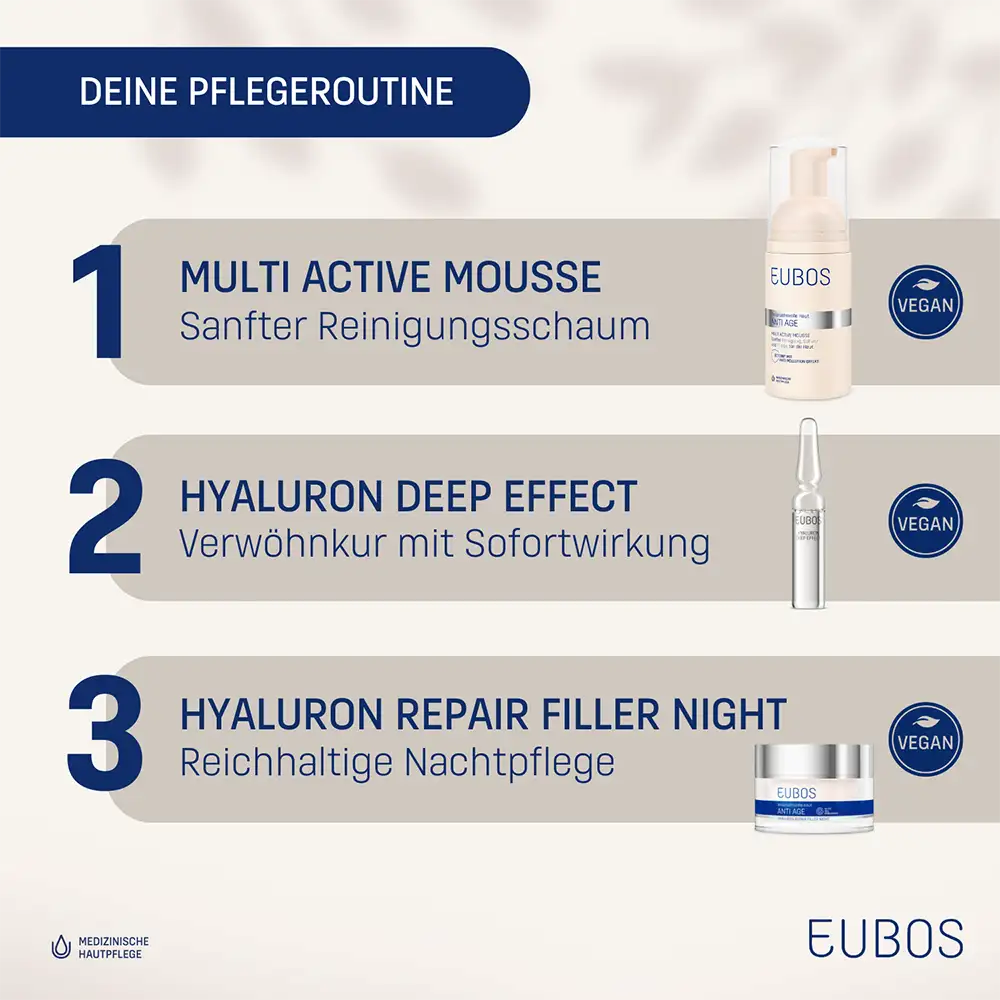 - 3-fach-Hyaluron speichert Feuchtigkeit und fördert die Zellerneuerung und Festigkeit der Haut