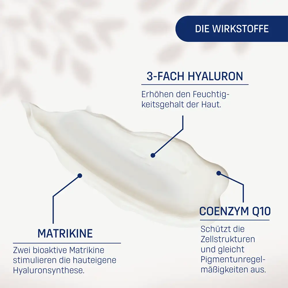 - 3-fach Hyaluron regt die hauteigene Hyaluronproduktion an und speichert Feuchtigkeit